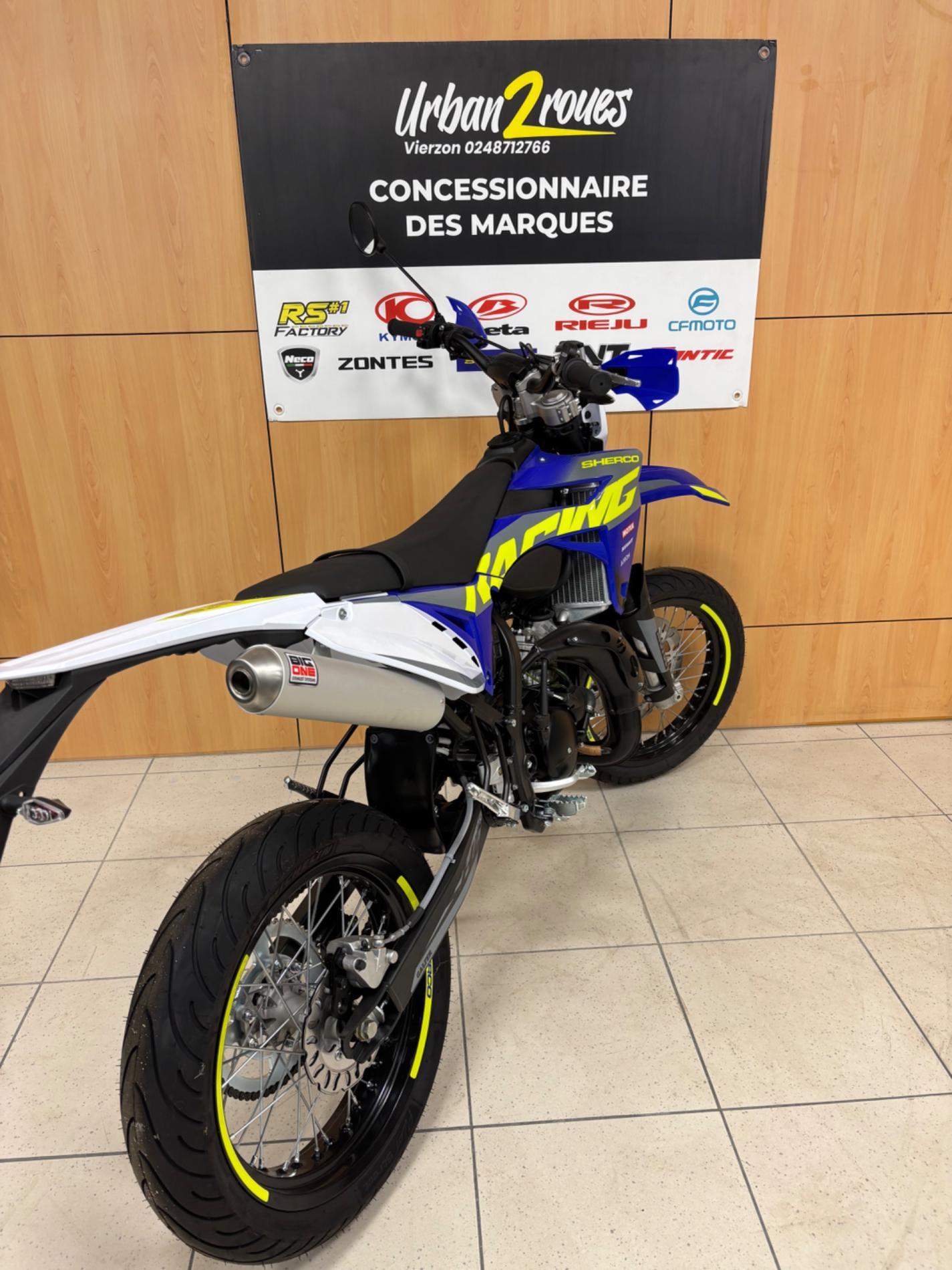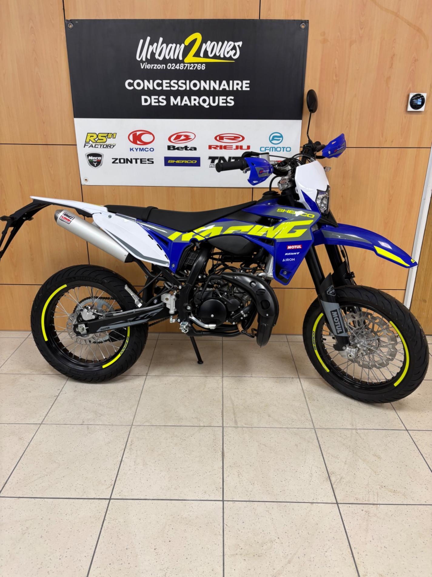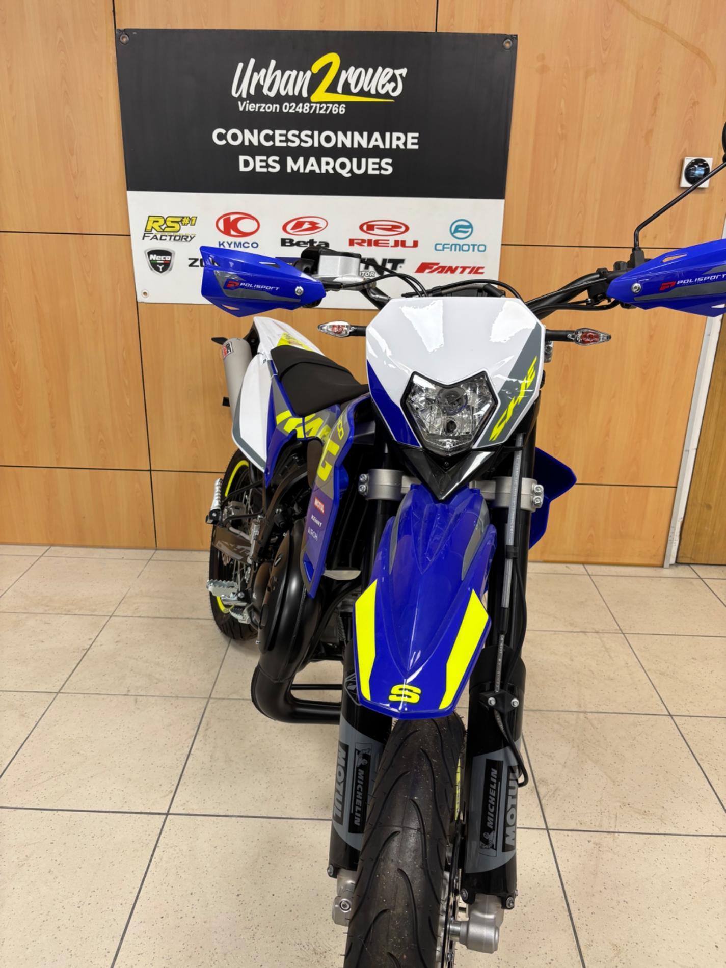 Vend cette moto Sherco SM Factory RS 50cc neuve, 0 km, de fabrication française, haut de gamme et sportive, idéale pour les jeunes conducteurs à la recherche de performance et de qualité.